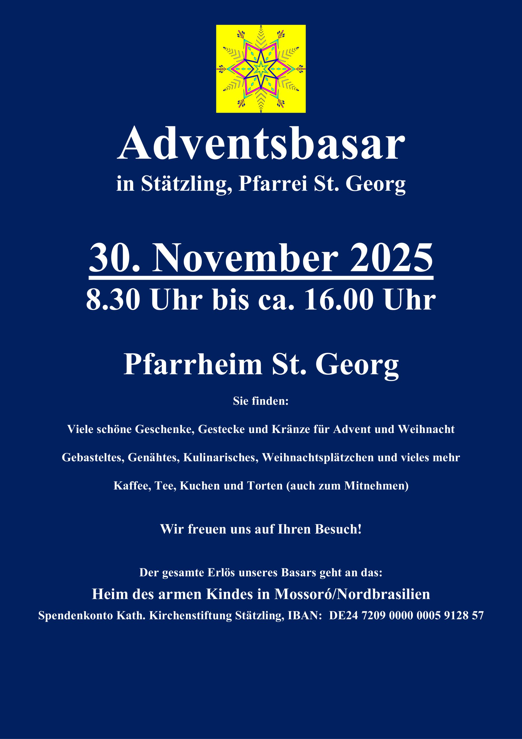 Adventsbasar St. Georg Stätzling + Zu Google Kalender hinzufügen + iCal / Outlook export Datum 30.Nov..2025 Uhrzeit 8:30 - 16:00 Veranstaltungsort Stätzling: Pfarrheim Kategorie Veranstaltung