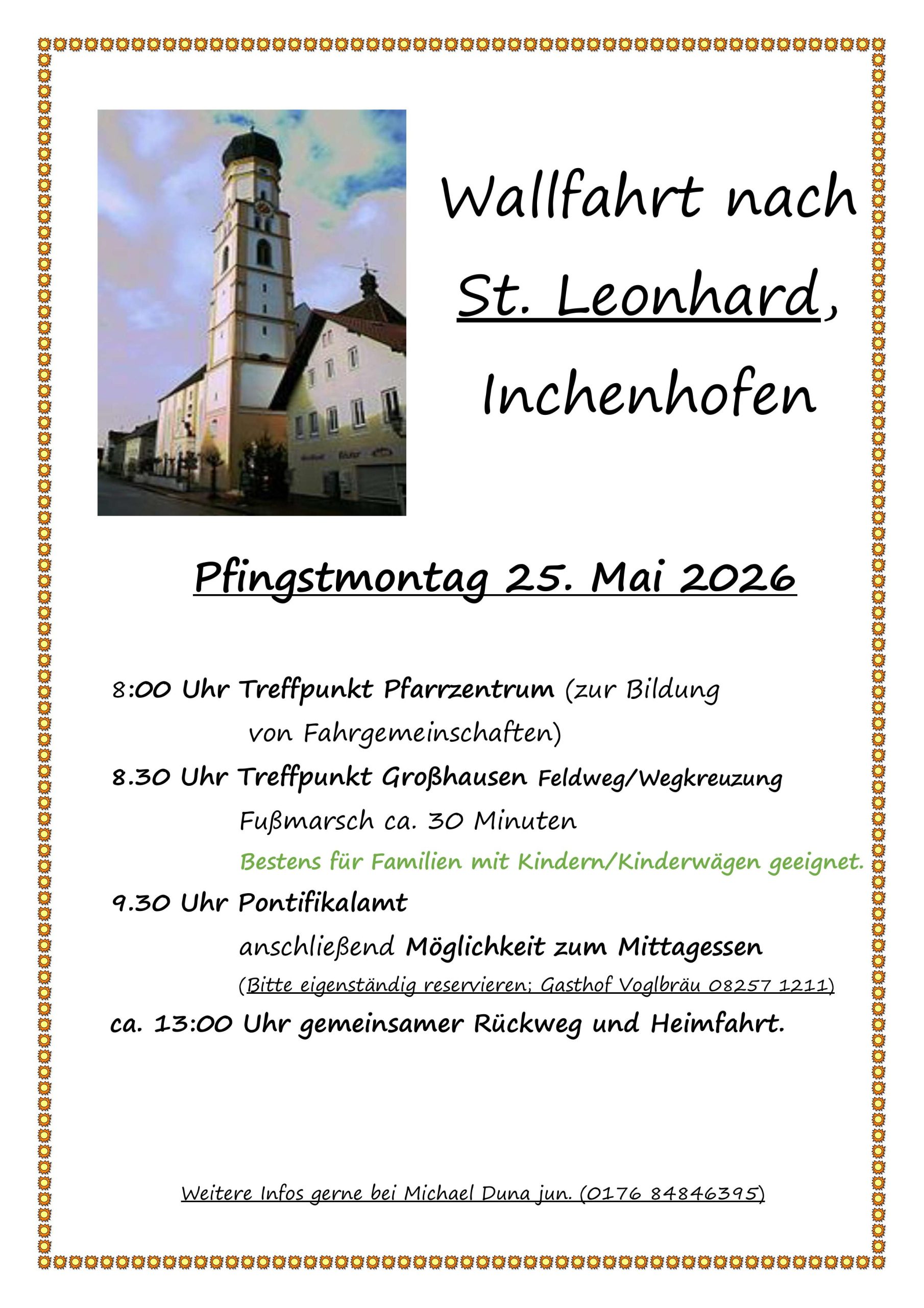 Wallfahrt nach Inchenhofen am Pfingstmontag + Zu Google Kalender hinzufügen + iCal / Outlook export Datum 25.Mai.2026 Uhrzeit Ganztägig Labels Familie und Kinder Kategorie Gottesdienst Veranstaltung