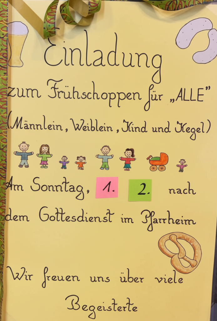 Herzliche Einladung zum Frühschoppen für “ALLE” am Sonntag, 1.2. nach dem Gottesdienst mit Kinderkirche (9 Uhr) im Pfarrheim Derching.